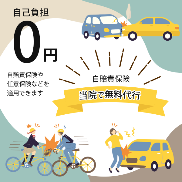 - 交通事故による治療は、自賠責保険適用となりますので患者さまの負担はありません。