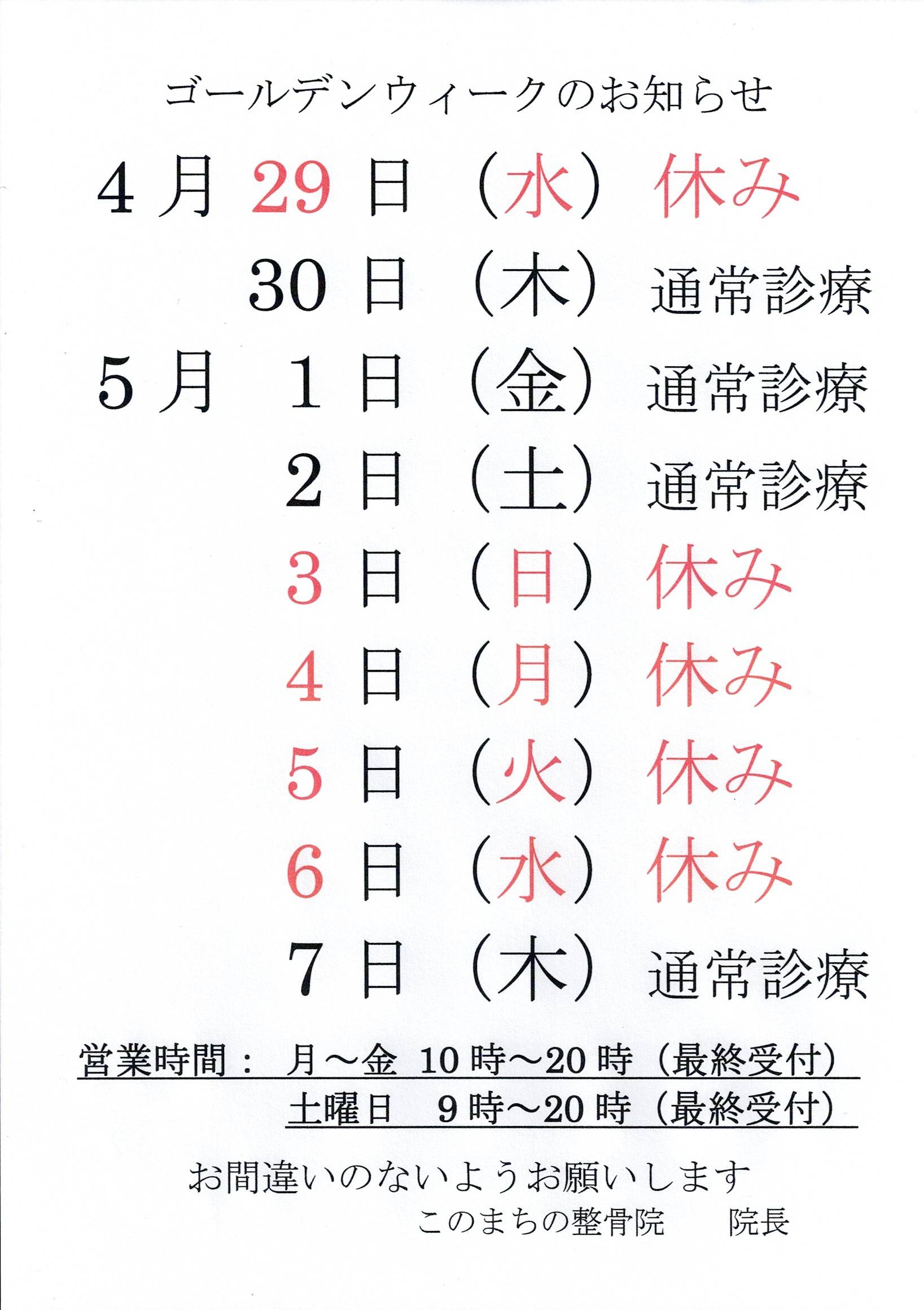 ゴールデンウィークのお休みのお知らせです4月29日(水)休診5月3日(日)~6日(水)休診となりますタイトルをタップすると大きい画像が見れます